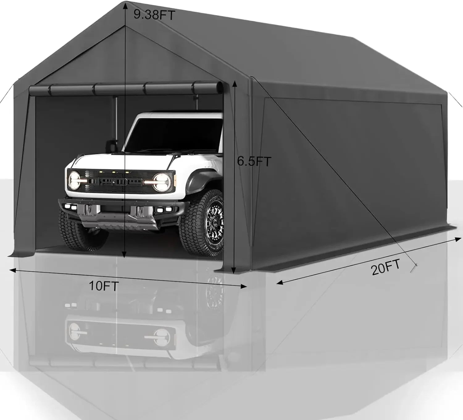 - 【Spacious Space】The 10'x20'x9.2' large-size Carport provides more space to park your vehicle, trucks, and boats. Removable sidewalls and doors diversify the use of the canopy, it is also suitable for outdoor events like camping, parties, weddings, and commercial fairs