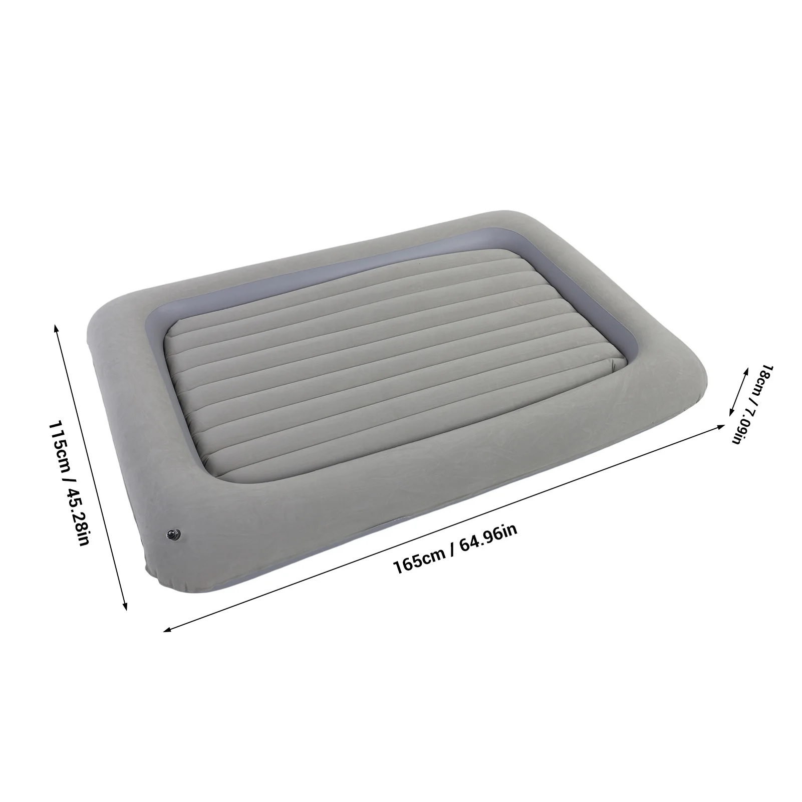 1. Large Portable Toddler Bed: This toddler travel bed is designed with both portability and space in mind. The inflatable toddler travel bed 64.96x 45.28x7.09in provides plenty of room to play and rest comfortably at the same time, making it ideal for families who are always on the go.2. Safe Comfortable Fabric: The travel toddler bed is made from PVC material that is puncture proof, ensuring it can withstand daily wear and tear. The flocking material provides a comfortable sleeping environment. The material is designed to provide warmth during cooler nights.