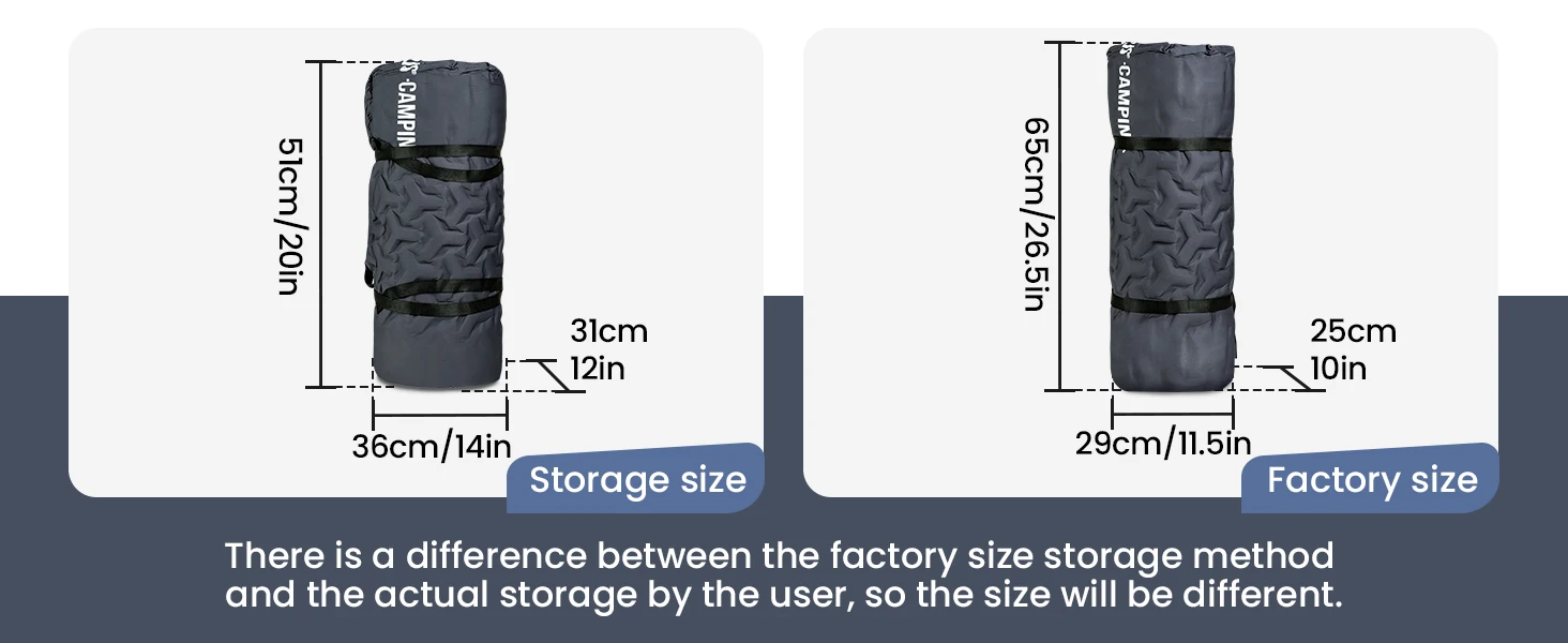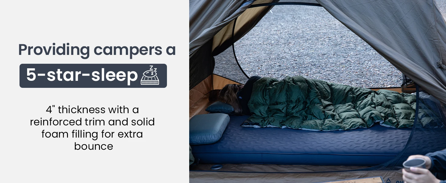 | EXTRA BOUNCE: The mattress is 4” (10cm) thick, with a reinforced trim and solid foam filling for extra bounce to provide campers a 5-star-sleep; this design also generates less noise when the sleeper moves around at night