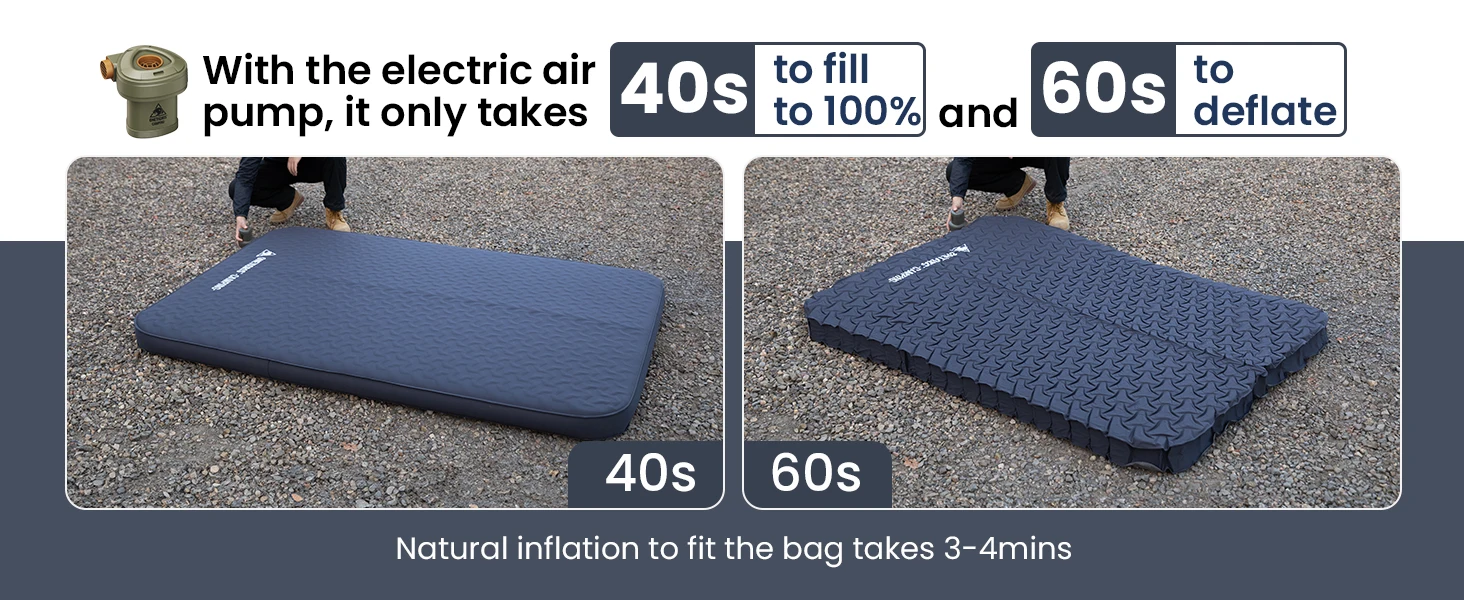 | FAST INFLATE/DEFLATE: Self-inflates to 80% when unfolded and fills up to 100% with 2-3 presses of the air pump sack that’s included with the product
