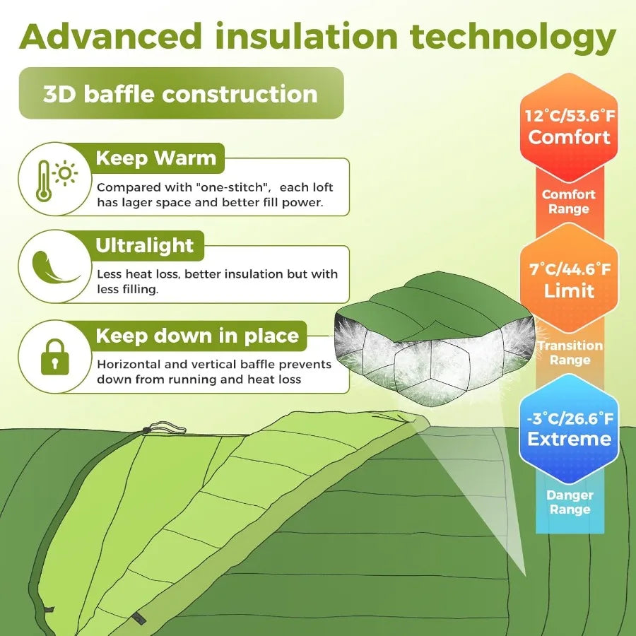 DOWN SLEEPING BAGS: Filled with 300g COLDMASTER Down, these sleeping bags for adults has unique vertical/horizontal baffle stitching to prevent cold spots, and windproof drawstrings and zipper draft tubes block chilling air flow. You can free your feet to stay cool in warm weather by opening the bottom zipper. Comfort rating 50℉, Limit rating 45℉, Extreme rating 25℉, it provides warmth as a 3 season sleeping bag
